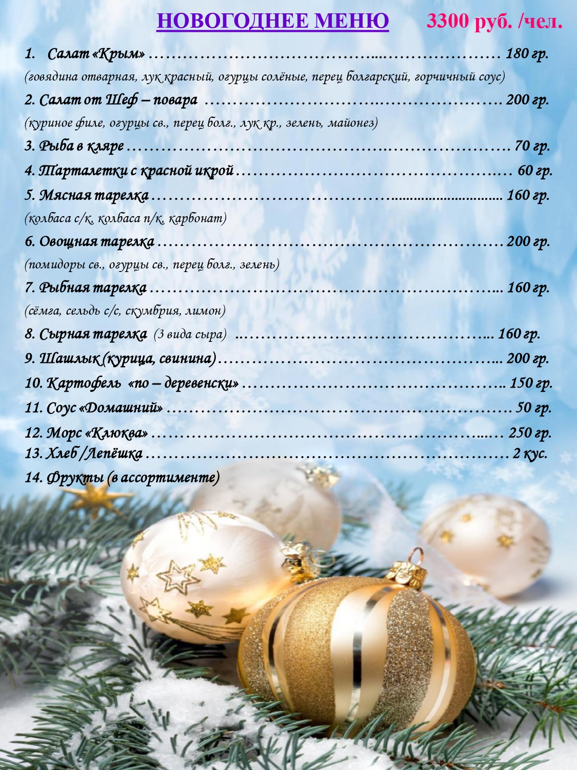 Приглашаем вас отметить новогодний корпоратив в уютной атмосфере кафе "Крым"! Погрузитесь в праздничное настроение вместе с коллегами, наслаждаясь специально подготовленным меню.