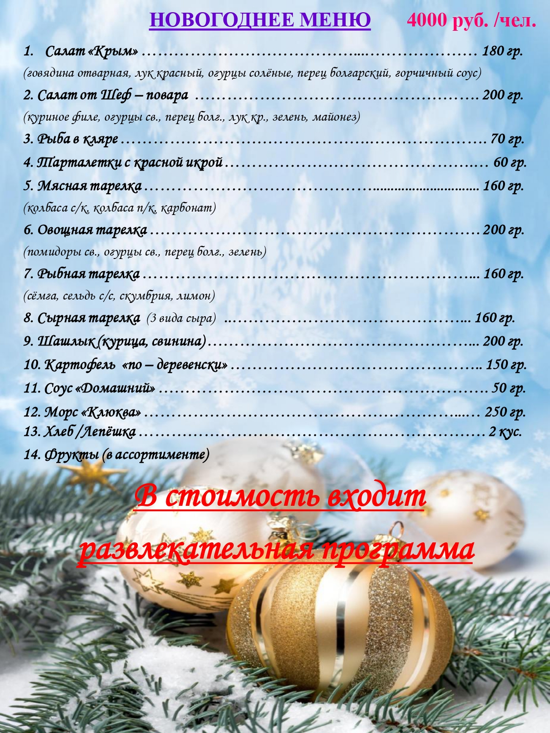 В меню представлены разнообразные закуски и горячие блюда. Вечер будет сопровождаться музыкой и развлекательной программой, чтобы сделать ваш праздник по-настоящему особенным.